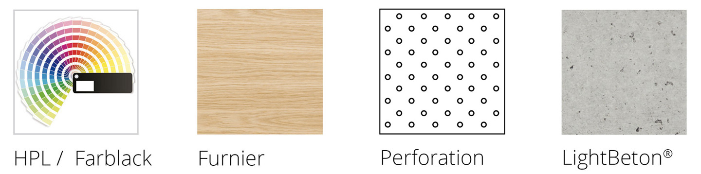 Es steht für die Gestaltung eine Vielzahl von HPL-Schichtstoffen, Melamin-Oberflächen und Farblackierungen gemäß RAL- oder NCS-Farbcode zur Auswahl.