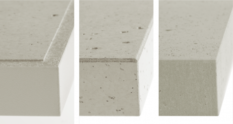 Die standardmäßig mit einer beidseitigen 1,5 mm homogenen Beton-Deckschicht ausgestatteten Platten lassen sich problemlos bearbeiten, z.B. für Fräsungen, Fasen und Rundungen.