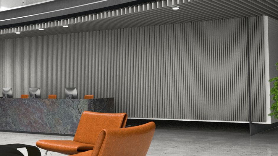 With the charm of natural surfaces - in combination with the acoustic effectiveness of felt - Acoustic-RibPanels Slim provide a quick and easy way to improve room acoustics. Depending on the selected slot pattern, incident sound is absorbed by the acoustic felt support in the slot area or reflected by the surface. In addition to the desired appearance, the selected slot grid also has an impact on the acoustic properties.