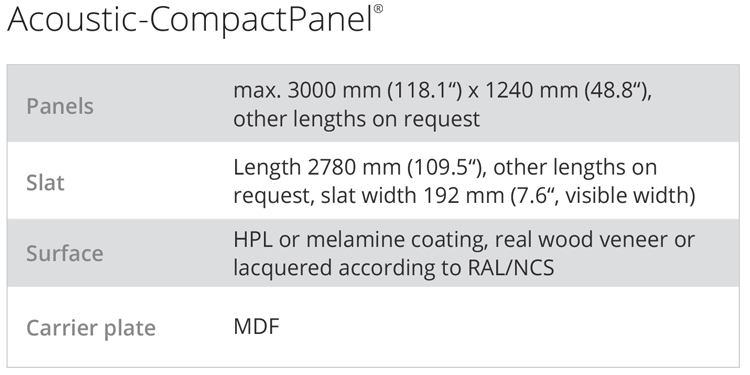 High absorption performance in all frequency ranges with an alpha w value of 0.8 for Acoustic-CompactLine®, 0.95 for Acoustic-CompactBoard® and up to 0.75 for Acoustic-CompactPanel®.